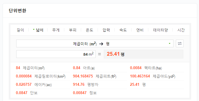 그런데 실제로 84㎡를 평으로 환산하면 25평이 된다.