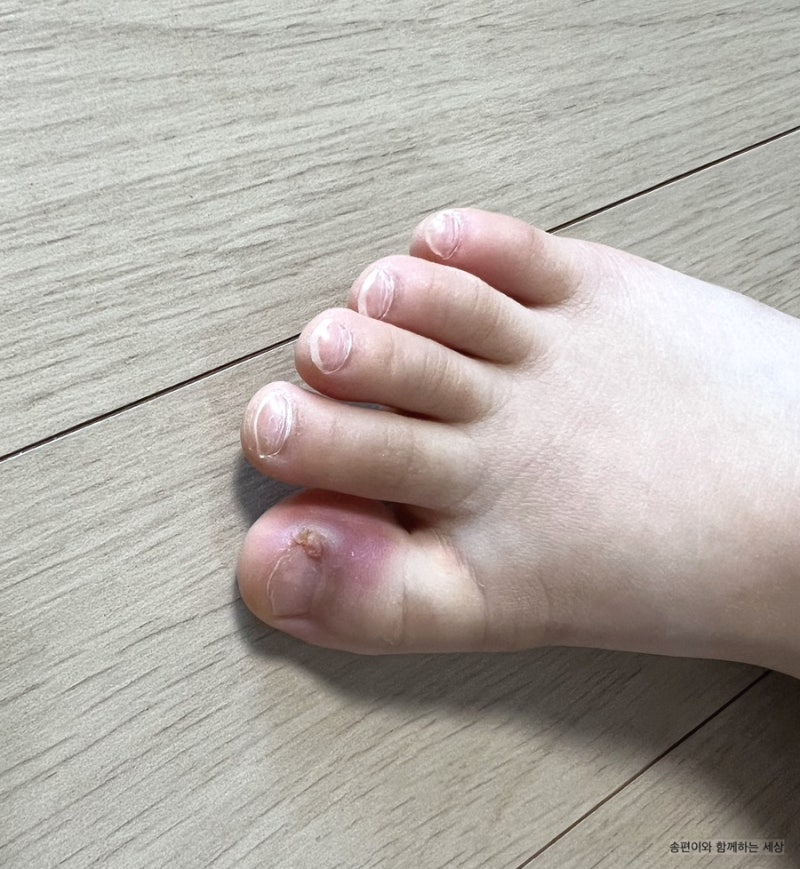 얼마 전에 우리 두 번째 심장 박동이 발가락이 아프다고 했어요! ! 처음에 발가락이라고 하더라구요~ 제가 잘못알았는데 어디를 쳤는지,,? ?양말을 벗고보니 엄지발톱 끝부분이 부어있었다::영유아 내성발톱 셀프치료::해봤다