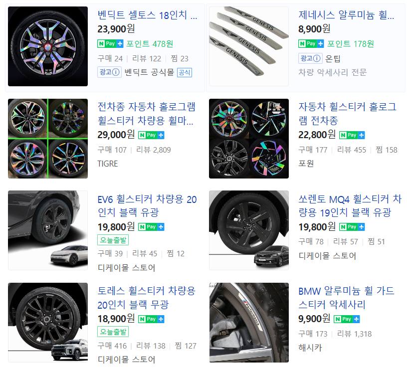 휠 데칼은 1) 휠 전체에 적용되는 데칼과 2) 작은 영역에만 적용되는 알루미늄 프로텍터의 두 가지 유형이 있습니다. 1) 시중에 반짝이는 홀로그램 제품이 많이 나와있고, 상처복원보다는 튜닝에 더 적합합니다. 가격대도 1만원대 후반부터 2만원대 후반까지 다양하다. #2) 특정 위치에만 붙일 수 있는 스티커입니다. 흉터가 크지 않은 경우 2번 스티커 구매를 권장합니다.