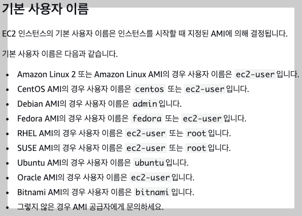 ec2 사용자는 인스턴스를 생성할 때 선택한 AMI에 따라 다릅니다. 다음 사항에 유의하십시오!
