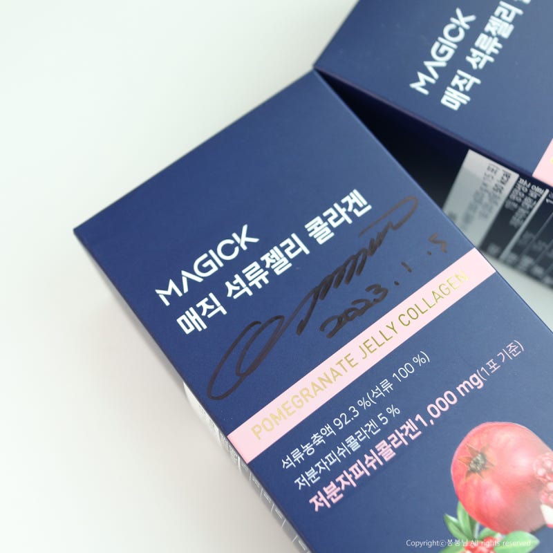 닥터프리핸드라는 방송**에서 실제로 박스에 싸인하는 장면이 있더라구요 ㅎㅎ** 인스타에서 스쿱 보고 박스 디자인에 대한 의견을 여쭙는데 뭐니뭐니해도 석류젤리 콜라겐은 그냥 출시된!