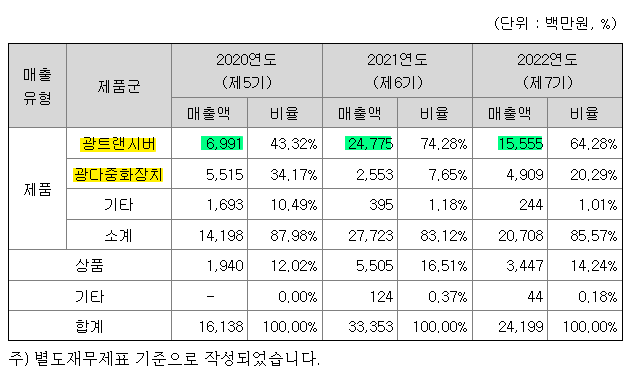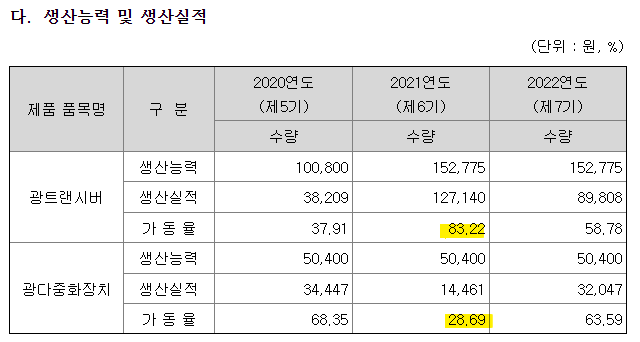 옵티코어가 2021년 매출 334억원을 달성했을 때 광송수신기 가동률은 83%에 달했다. 이를 감안하면 실제로는 광트랜시버의 경우에도 옵티코어의 연간 광트랜시버 생산능력을 최대 20% 정도 늘릴 수 있다. 149% 증가가 가능해 옵티코어의 최대 매출 잠재력은 386억원이다.