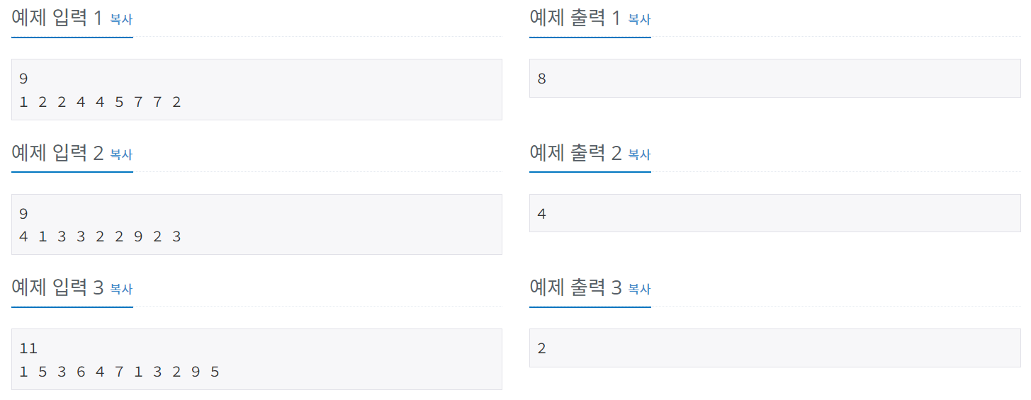 시퀀스 N의 길이는 첫 번째 줄에 주어지고 N개의 숫자는 그 사이에 공백을 두고 두 번째 줄에 주어집니다. N은 1 이상 100,000 이하의 정수이다.